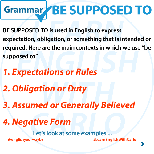 “Be supposed to” is used to express what is expected, required, or assumed in a given situation. Whether you’re talking about rules, responsibilities, or common beliefs, this phrase helps convey those ideas. Here are the key contexts in which we use “be supposed to.”