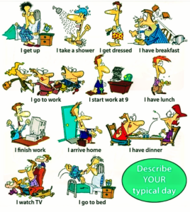 When we talk about things that we do every day, we use the simple present tense. I get up. I take a shower. I get dressed. I have breakfast. I go to work. I start work at 9 am. I have lunch. I finish work. I arrive home. I have dinner. I watch TV. I …