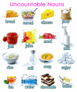 In English, an uncountable noun refers to something (a thing or an idea) that we generally don’t count. Typicall uncountable nouns are liquids, abstract iteas, powders and grains, natural phenomena, and states. The above graphic shows some of the more common uncountable items that we see in everyday life. If we want to quantify any …