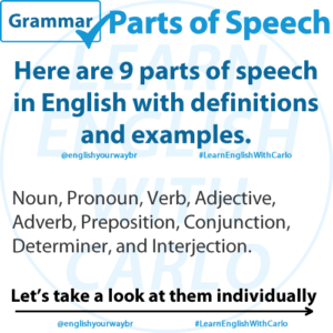 Here are 9 parts of speech in English with definitions and examples. NOUN A noun is a word used to identify a person, place, thing, or idea. Nouns are the basic building blocks of sentences and are essential for communication in any language. Examples of nouns include “dog,” “car,” “teacher,” “city,” and “happiness.” Nouns can …