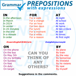 Here are some common prepositional phrases, also known as Collocations with prepositions. Prepositional Phrases for Time: Prepositional Phrases for Location or Movement: Prepositional Phrases for Cause or Reason: Prepositional Phrases for State or Condition: Prepositional Phrases for Manner or Degree: PREPOSITIONS with expressions INIn the afternoonIn MarchIn 2024In winterIn 20 minutesIn the endIn a minuteIn …