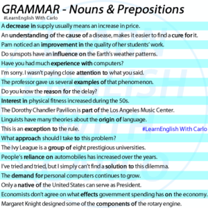 Certain nouns are often accompanied by specific prepositions, creating noun-preposition collocations. For instance, when we use the noun “interest,” it is typically followed by the preposition “in.” Similarly, “contact” pairs with “with,” and “room” with “for.” For example: Recognizing which preposition to use in these collocations can be challenging. One helpful strategy is to consider …