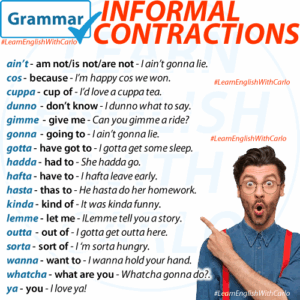 VOCABULARY – Informal (spoken) Contractions In English, as in most other languages, there are ways to shorten groups of words that commonly go together. We don’t do this in writing, just when we speak. They are called informal or spoken, contractions. ain’t – am not/is not/are not – I ain’t gonna lie. cos – because …