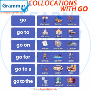 GRAMMAR – Collocations with GO Native English speakers use the word GO almost daily. Try using some of these collocations in your everyday speech and learn how it can go into virtually any sentence. Can you think of any other collocations using the word go? Let us know with a comment! GO shopping GO dancing …