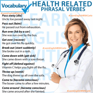 GRAMMAR – PHRASAL VERBS & HEALTH Pass away [die] Uncle Joe passed away last night. Pass out [faint] He passed out from exhaustion. Run over [hit by a car] She was run over by the bus. Get over [recover] He got over his flu quickly. Break out [start suddenly] She broke out in a rash. …