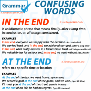 GRAMMAR – AT THE END vs IN THE END English learners often confuse the phrases at the end and in the end because they sound similar. However, their meanings and usage are distinct. Let’s break them down and look at some examples to help you use these phrases correctly. What Does AT THE END Mean? …