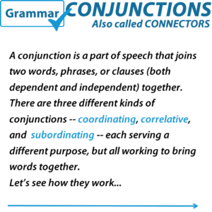 A conjunction is a part of speech that joins two words, phrases, or clauses (both dependent and independent) together. There are three different kinds of conjunctions — coordinating, correlative, and subordinating — each serving a different purpose, but all working to bring words together.Let’s see how they work… Coordinating conjunctions are used to join equal …