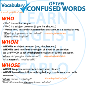 These three words are often confused. Here’s a brief explanation of the differences between “who,” “whom,” and “whose”: 1. Who: 2. Whom: 3. Whose: Usage Tips: Examples: Understanding these differences will help you choose the correct word in various contexts. Practice using them in sentences with the QUIZ below!