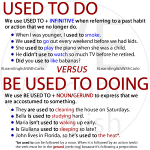 “Used to” refers to past habits or situations that are no longer true in the present.“Be used to” refers to the state of being familiar or accustomed to something in the present. Used to: “Used to” is a phrase used to describe past habits or situations that were true in the past but are no …