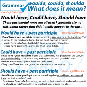You may have heard native English speakers use phrases like woulda, coulda, or shoulda. But what do they mean? These are informal, spoken forms of would have, could have, and should have. These past modal verbs are used to talk about things that didn’t happen, but that we imagine or wish had been different. Let’s …