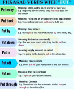 A phrasal verb is a combination of a verb and an adverb or preposition, for example ‘look up’ or ‘look after’, which together have a particular meaning which is different from the verb alone. Here are the definitions and examples for each of the phrasal verbs listed: 1. Put away– Definition: To place something in its appropriate location; to …