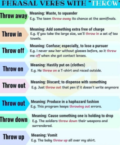 A phrasal verb is a combination of a verb and an adverb or preposition, for example ‘look up’ or ‘look after’, which together have a particular meaning which is different from the verb alone. Phrasal verbs with “throw” have a range of meanings depending on the preposition or adverb they are paired with. Here are the definitions and examples …
