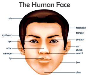 The human head and face is made up of a lot of individual parts many of which are in pairs. Here are the parts in the image: Hair A forehead Two temples Two eyebrows Two sets of eyelashes Two eyes Two ears Two earlobes A nose Two nostrils Two cheeks Two lips (upper and lower) …