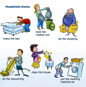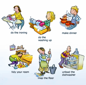 There are lots of things to do around the house every day. We use DO and MAKE with a lot of these activities. Who does the house work in your house? What chores do you do around your house? I sometimes do the ironing. I always do the washing up. I sometimes make dinner. I …