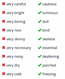 The word VERY is an adverb and an intensifier – it comes before an adverb or adjective to make it more intense (to a higher degree). Say cautious instead of very careful. Say luminous instead of very bright. Say dull instead of very boring. Say kind instead of very nice. (describing a person) Say skeletal instead of very skinny. …