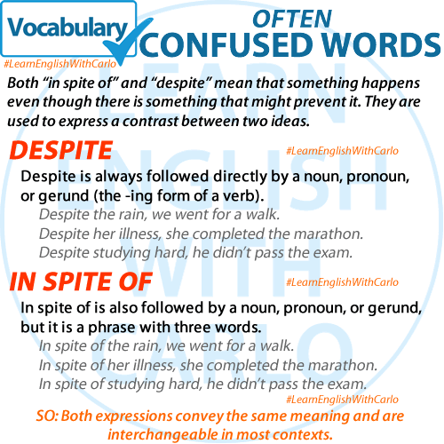 By practicing these structures and understanding that “despite” and “in spite of” are interchangeable with slight differences in form, your students should be able to use both expressions correctly and confidently.