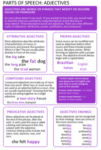 A noun alone doesn’t say much. If you wanted to buy shirt, you would need to describe what you wanted by using descriptive words like blue or long-sleeved. These descriptive words are adjectives. There are a few different types of adjectives: attributive, proper, predicative, and compound. Attributive Adjectives: Most adjectives describe attributes (characteristics) of nouns …
