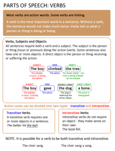 Parts of Speech: Verbs Most verbs are action words. Some are linking. A verb is the most important word in a sentence. Without the verb, the sentence wouldn’t make much sense. The verb tells us what the subject (person or thing) is doing or being. Verbs, Subjects, and Objects All sentences require both a subject …
