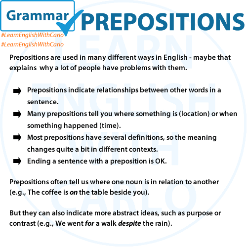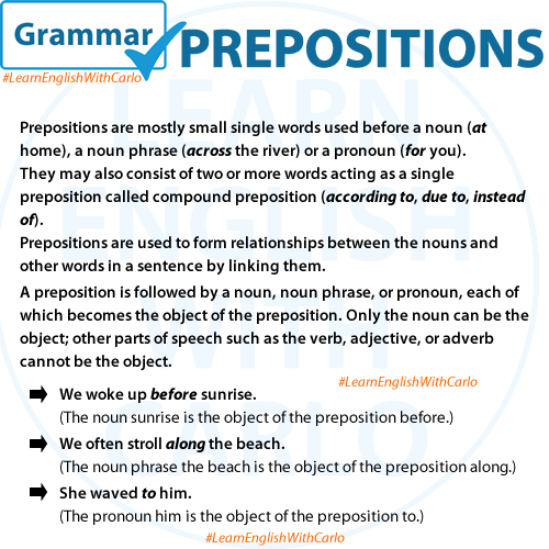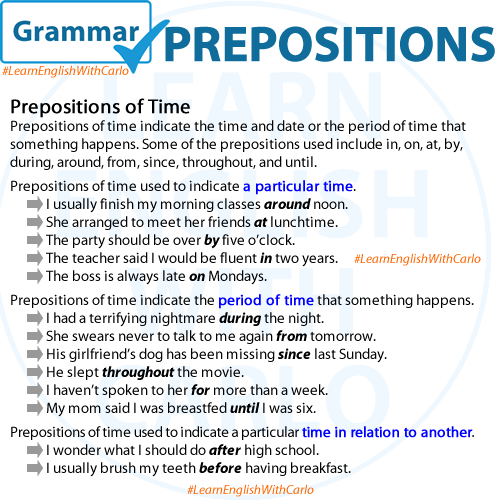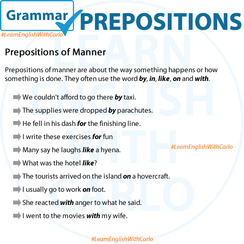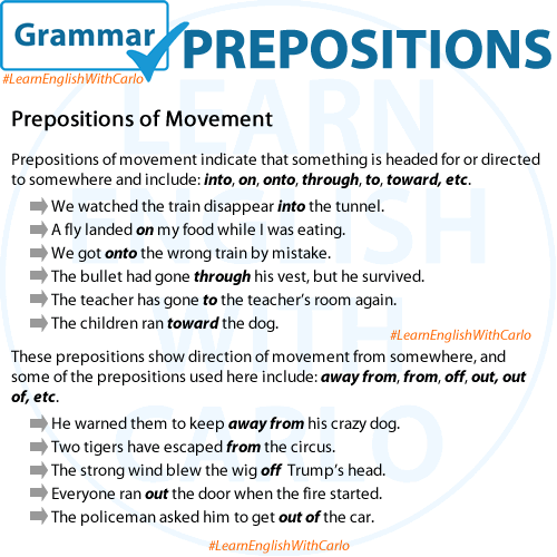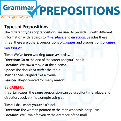 The different types of prepositions are used to provide us with different information with regard to time (prepositions of time), place (prepositions of place), and direction (prepositions of movement). Besides these three, there are others: prepositions of manner and prepositions of cause and reason.