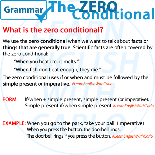 The outcomes are universally true in these cases, making the Zero Conditional ideal for describing rules and certainties. The zero conditional uses if or when and must be followed by the simple present or imperative.