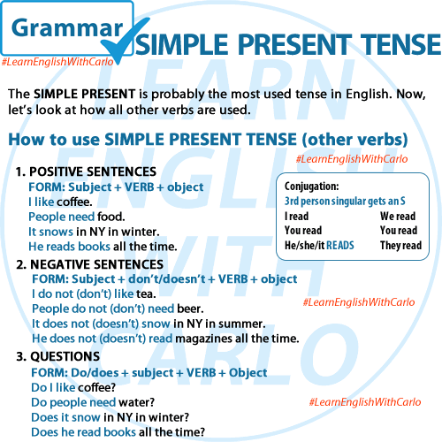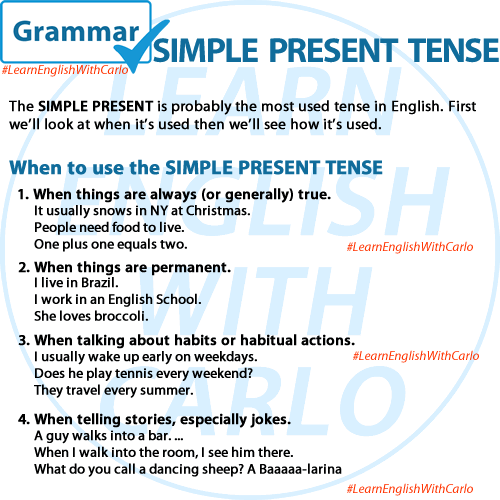 The SIMPLE PRESENT is probably the most used tense in English. First, we’ll look at when it’s used then we’ll see how it’s used.