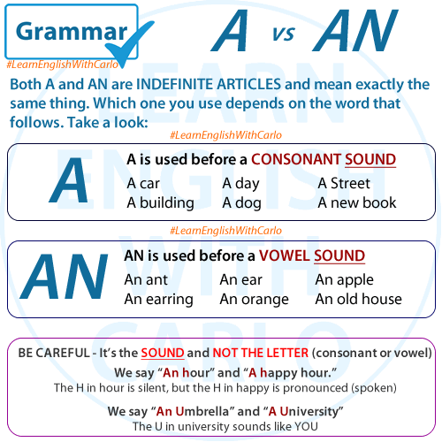 Here, AN precedes words that start with vowel sounds like A, E, I, O, and U.