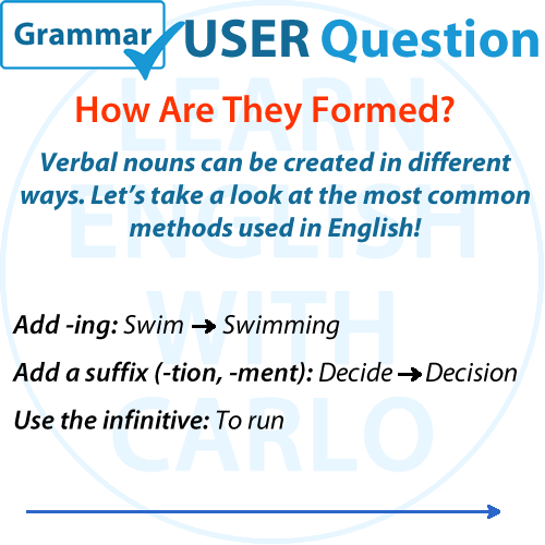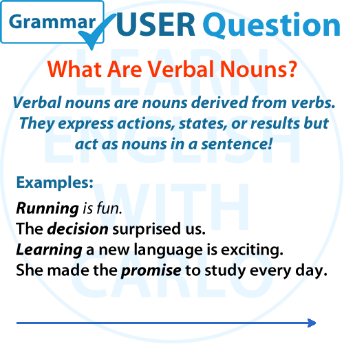 Verbal nouns are a versatile part of the English language that allow us to turn actions into ideas. Whether you’re using gerunds, infinitives, or suffix-derived nouns, understanding how to form and use verbal nouns will elevate your English skills. Keep practicing, and soon you’ll recognize and use verbal nouns like a pro!