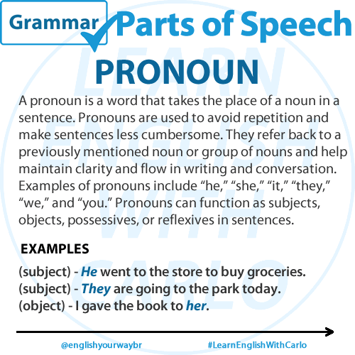 A pronoun is a word that takes the place of a noun in a sentence. Pronouns are used to avoid repetition and make sentences less cumbersome. They refer back to a previously mentioned noun or group of nouns and help maintain clarity and flow in writing and conversation. Examples of pronouns include “he,” “she,” “it,” “they,” “we,” and “you.” Pronouns can function as subjects, objects, possessives, or reflexives in sentences.