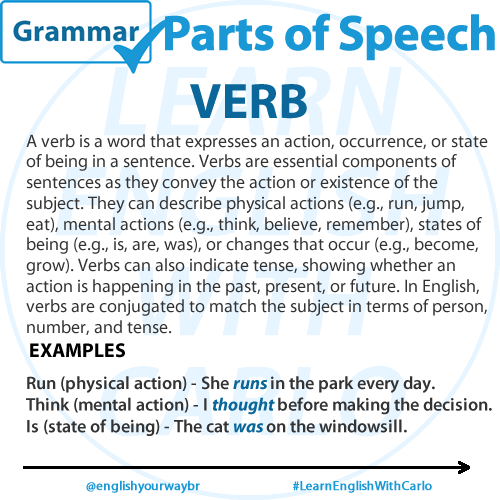 A verb is a word that expresses an action, occurrence, or state of being in a sentence. Verbs are essential components of sentences as they convey the action or existence of the subject. They can describe physical actions (e.g., run, jump, eat), mental actions (e.g., think, believe, remember), states of being (e.g., is, are, was), or changes that occur (e.g., become, grow). Verbs can also indicate tense, showing whether an action is happening in the past, present, or future. In English, verbs are conjugated to match the subject in terms of person, number, and tense.