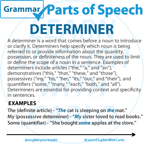 A determiner is a word that comes before a noun to introduce or clarify it. Determiners help specify which noun is being referred to or provide information about the quantity, possession, or definiteness of the noun. They are used to limit or define the scope of a noun in a sentence. Examples of determiners include articles (such as “the,” “a,” and “an”), demonstratives (such as “this,” “that,” “these,” and “those”), possessives (such as “my,” “your,” “his,” “her,” “its,” “our,” and “their”), and quantifiers (such as “some,” “many,” “few,” “several,” “each,” “every,” “both,” “neither,” and “all”). Determiners are essential for providing context and specificity in sentences.