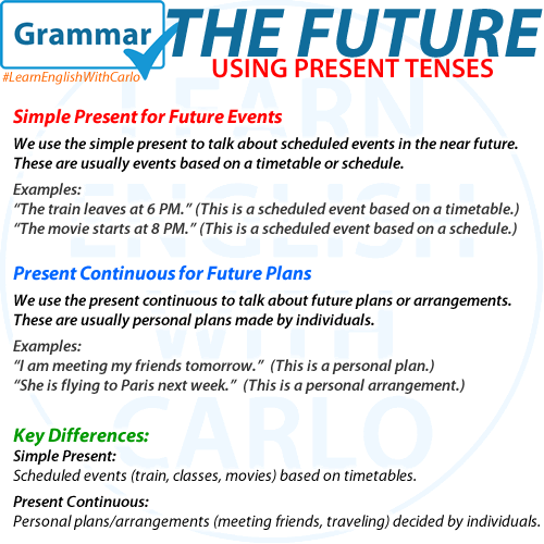 Did you know we can use the simple present and the present continuous tenses to talk about the future?