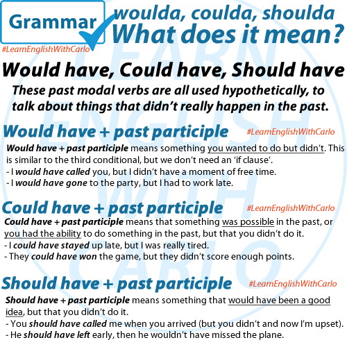 You may have heard native English speakers use phrases like woulda, coulda, or shoulda. But what do they mean? These are informal, spoken forms of would have, could have, and should have. These past modal verbs are used to talk about things that didn’t happen, but that we imagine or wish had been different.